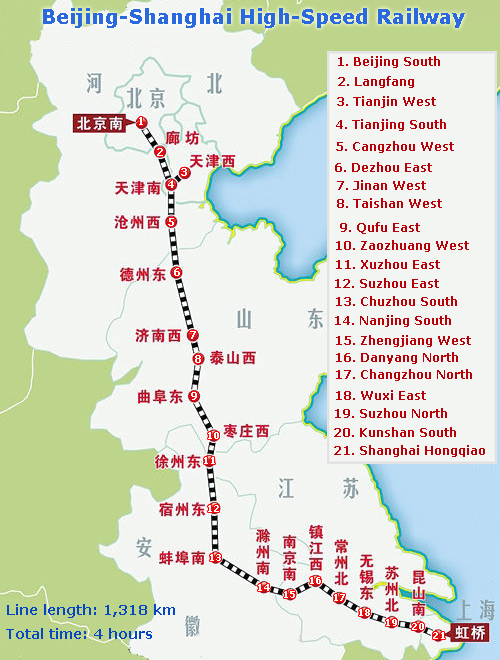 The Beijing–Shanghai High-Speed Railway, or abbreviated as the Jinghu HSR, is a 1,318 kilometres (819 mi) long high-speed railway that connects two major economic zones in China: the Bohai Sea Rim(centered on Beijing) and the Yangtze River Delta(centered on Shanghai). Having been built for 2 years, the line is scheduled to be put into commercial service on June 20, 2011.
