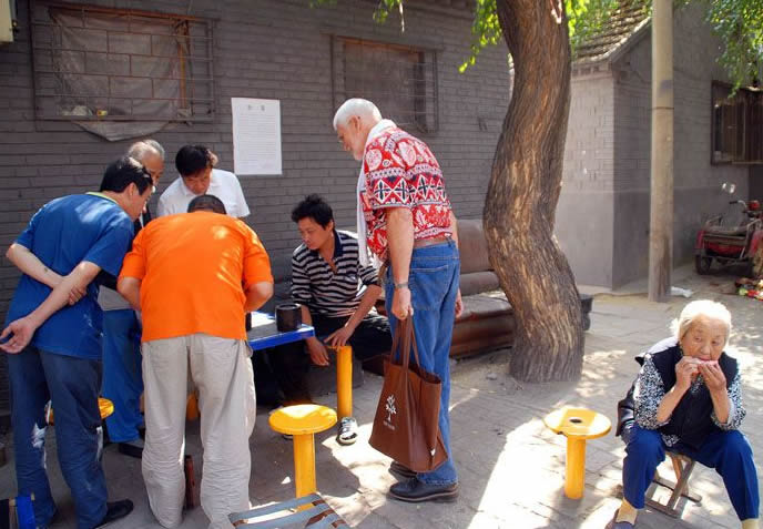 There are always many local elderly men gathering together here to play chess in the Hutongs.