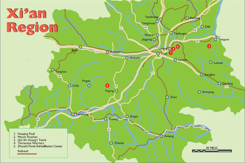 This map shows the location of Xian City, Mt.Hua and Panda Base.