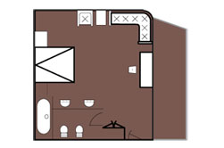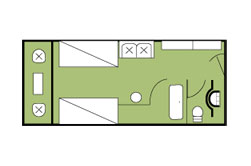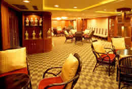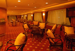 Facilities include two restaurants (a single-seating main dining room, and an a la carte restaurant on the top deck), two elevators, a three-story atrium lobby, two lounges, three bars, a gym, lecture room, library, beauty salon, massage room, and gift shop.